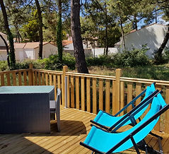 Vous disposerez d'un lit 160, d'une salle de douche, table, chaises, un coin de courtoisie avec un petit frigo et bouilloire, une salle de douche avec wc et une terrasse privée en bois avec salon de jardin et transats à la belle saison.